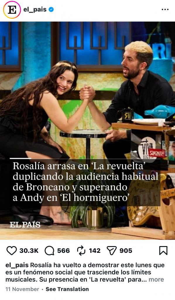 What should’ve been harmless competition turned into a political and ideological war, fuelled by online outrage and partisan commentary. Right-wing El Mundo and left-leaning El Pais even posted nightly Instagram updates on who “won” the ratings war. It’s a perfect example of how both traditional and social media get weaponised – not to inform, but to monetise attention.